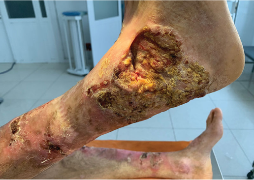 Cáncer de piel causado por una infección por hongos. Posteriormente, tuvieron que amputarle las piernas debido a la aparición de gangrena.